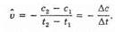По мере расходования вещества А скорость реакции уменьшается. Отсюда следует, что скорость реакции может быть определена лишь для некоторого промежутка времени. Так как концентрация вещества А в момент времени t1 измеряется величиной c1 а в момент времени t2 — величиной с2 , то за промежуток времени Dt=t2-t1 изменение концентрации вещества составит Dс=с2-с1, откуда определится средняя скорость реакции (v^):
