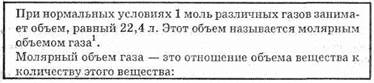 Из закона Авогадро вытекает важное следствие: при одинаковых условиях 1 моль любого газа занимает одинаковый объем. Этот объем можно вычислить, если известна масса 1 л газа. При нормальных условиях, т.е. температуре 273 К (0° С) и давлении 101325 Па, масса 1 л водорода равна 0,09 г, молярная масса его равна 1,008 • 2 = 2,016 г/моль. Тогда объем, занимаемый 1 молем водорода, равен