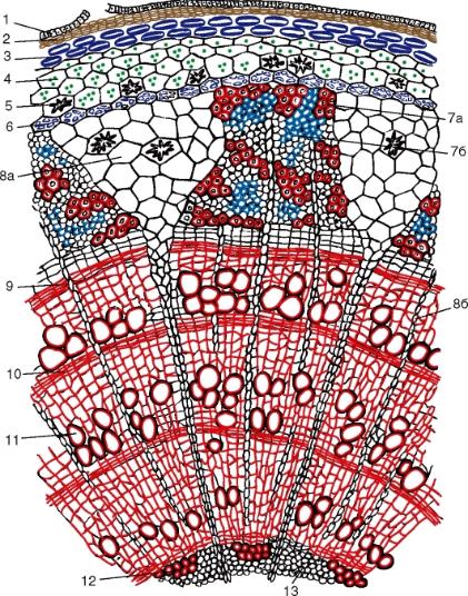 Рис. 3.39.Непучковое строение трехлетней ветви липы (поперечный срез): 1 - остатки эпидермы; 2 - пробка; 3 - пластинчатая колленхима; 4 - хлоренхима; 5 - друзы; 6 - эндодерма; 7 - флоэма: 7а - твердый луб (лубяные волокна); 7б - мягкий луб (ситовидные трубочки с клетками-спутницами и лубяная паренхима); 8а - первичный сердцевинный луч; 8б - вторичный сердцевинный луч; 9 - камбий; 10 - осенняя древесина; 11 - весенняя древесина; 12 - первичная ксилема; 13 - паренхима сердцевины