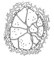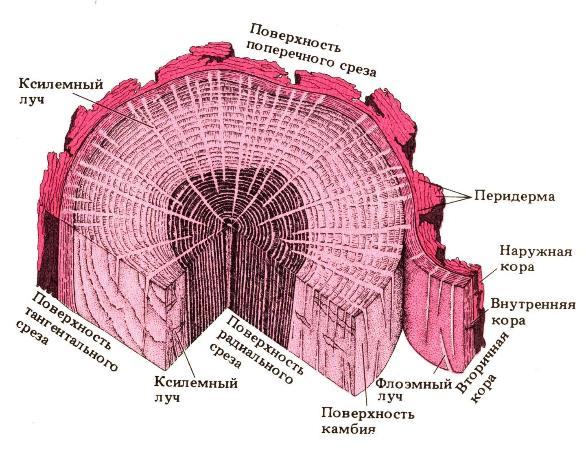 Центр ствола занят вторичной ксилемой (древесиной), составляющей около 0,9 всего объема органа (рис. 4.41 ). На поверхности древесины находится тончайший слой камбия, а кнаружи от него – вторичная кора. В состав вторичной коры входят: вторичная флоэма (луб), остатки первичной флоэмы и первичной коры, а также перидерма, сменившая эпидерму в качестве покровной ткани. Позднее первичные ткани становятся совершенно неразличимыми, а из наружных слоев вторичной коры формируется третичная покровная ткань – корка. Мертвую корку часто называют наружной корой, а живую часть коры между камбием и самым внутренним слоем феллогена – внутренней корой.