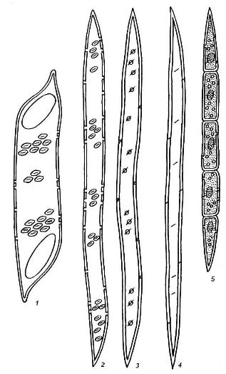 Рис. 4.42. Элементы, входящие в состав вертикальной системы древесины: 1 – членик сосуда; 2, 3 – трахеиды; 4 – древесинное волокно (волокно либриформа); 5 – тяж древесинной паренхимы.