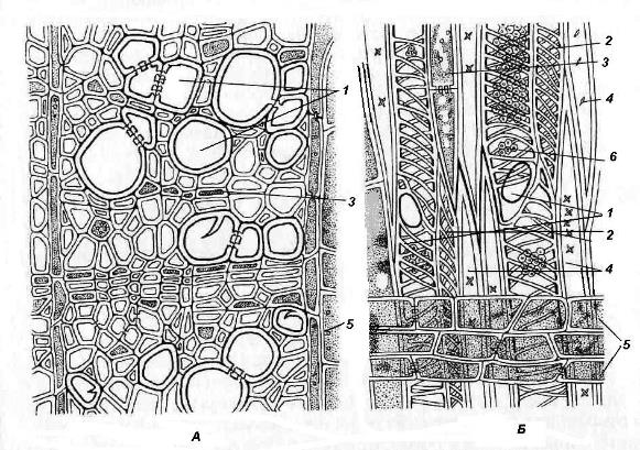 Рис. 4.43. Строение древесины липы на поперечном (А) и радиальном (Б) срезах: 1 – сосуды; 2 – трахеиды; 3 – древесинная паренхима; 4 – древесинные волокна (волокна либриформа); 5 – древесинный луч; 6 – окаймленная пора.
