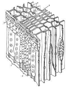 Рис. 4.45. Схема строения древесины хвойного растения : 1 – ранняя древесина; 2 - поздняя древесина; 3 – луч; 4 – окаймленные поры; 5 – граница годичного кольца.