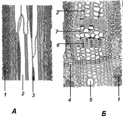 Рис. 4.46. Строение вторичного луба винограда : А – продольный тангенциальный срез; Б – поперечный срез; 1 – сердцевинный луч; 2 – ситовидная трубка; 3 – сопровождающая клетка; 4 – камбий; 5 – древесина; 6 – лубяные волокна (твердый луб); 7 – мягкий луб.