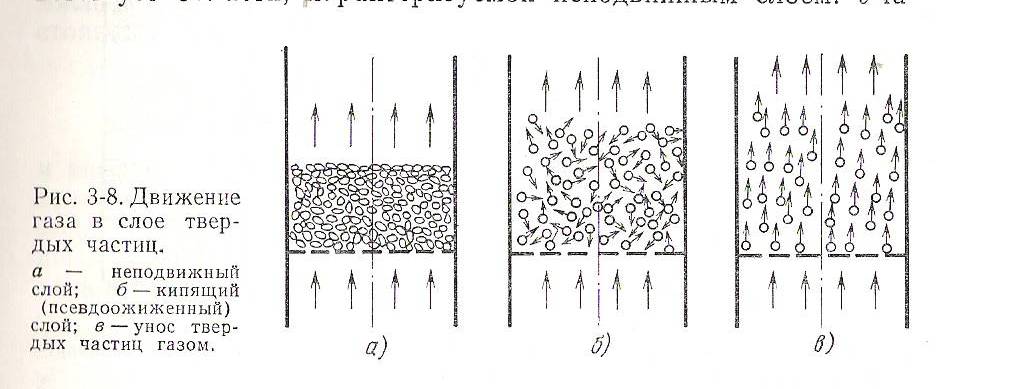 Рассмотрим принцип образования кипящего слоя. При небольшой скорости газа слой твердых частиц, через который проходит газ, неподвижен (рис. 3-8, а).
