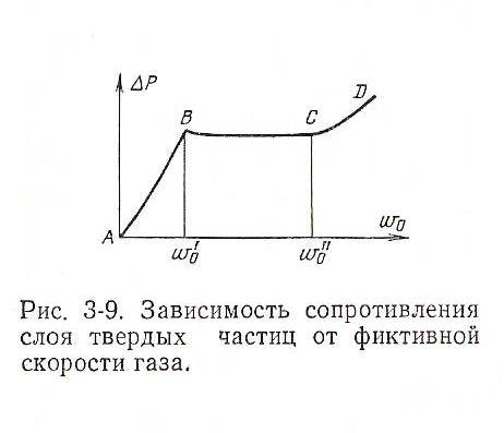 Участок АВ соответствует области, характеризуемой неподвижным слоем. Участок ВС соответствует кипящнму слою и характеризуется постоянным, не зависящим от скорости сопротивлением. На участке СD, соответствующем уносу частиц потоком, сопротивление снова возрастает с увеличением скорости.