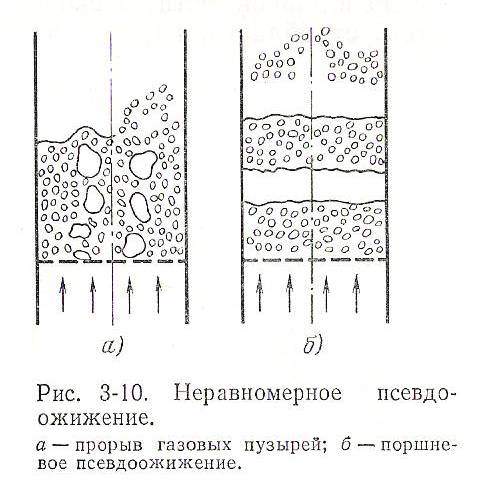 Называется числом псевдоожижения и характеризует интенсивность перемешивания частиц в кипящем (псевдоожиженном) слое. Опытами установлено, что наиболее интенсивное перемешивание соответствует W = 2. При дальнейшем возрастании величины W слой частиц становится неоднородным: происходит прорыв крупных пузырей газа через слой (рис. 3-10, а), и частицы начинают интенсивно выбрасываться над поверхностью слоя.