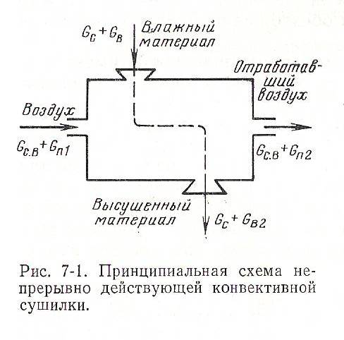 Рассматривая процесс конвективной сушки, когда взаимодействуют воздух и влажный материал, следует подчеркнуть, что воздух в этом случае не только теплоноситель, но и влагопоглотитель. Составим материальный и тепловой балансы, кг/ч, для простейшего случая непрерывной сушки влажного материла нагретым воздухом. Будем считать, что сушимый материал и нагретый воздух состоят из сухой части Gс и Lс.в. и влаги Gв и G п, т. е. Gм = Gс + Gв и G воз. = Lс.в. + Gп. Запишем приходную и расходную части материального баланса непрерывно действующей сушилки с однократным использованием воздуха, принципиальная схема которого приведена на рис. 7-1: