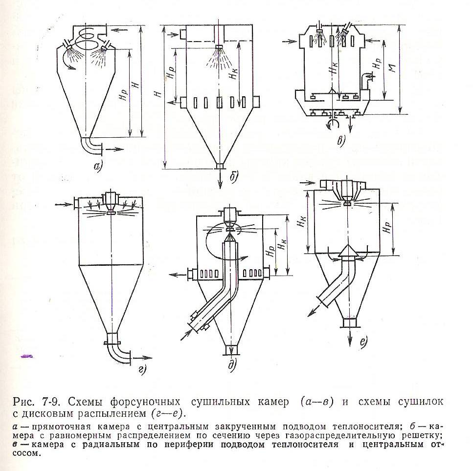 В распылительных сушилках принципиально возможно осуществление прямотока (рис. 7-9, а ,в-е ) и противотока (рис. 7-9, б) при движении высушиваемого продукта и теплоносителя.