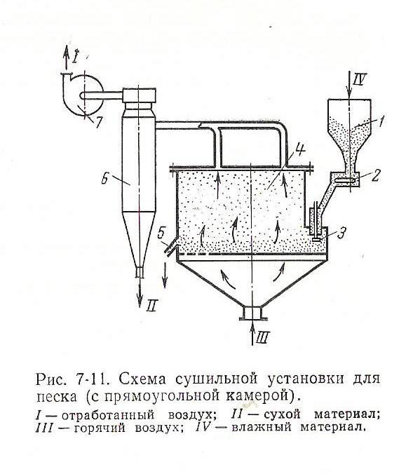 Однокамерные сушилки (рис. 7-11) наиболее просты в конструктивном и эксплуатационном отношениях, обладают хорошими экономическими показателями. Влажный материал из бункера 1 непрерывно поступает в сушильную камеру 4. Для возможности плавного регулирования количества подаваемого материала установлены дисковый клапан 2 и загрузочный клапан 3. Под решетку подается теплоноситель. Высушенный материал через патрубок 5 поступает в бункер готового продукта. Отработавший теплоноситель вместе с испаренной влагой и захваченными мелкими частицами высушиваемого материала отсасывается вентилятором 7. Дляотделения унесенных из псевдоожиженного слоя частиц от газового потока устанавливается циклон 6. В аппаратах такого типа при сушке влажного материала в зависимости от параметров теплоносителя влагосъём с 1 м2 решетки достигает 500-1000 кг/ч и более при удельном расходе сухих газов 3-12 кг на 1 кг испаренной влаги.