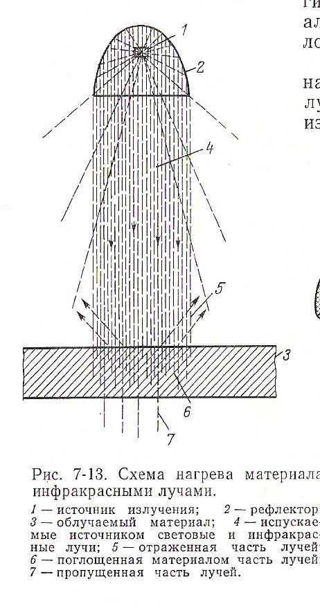 Световые и инфракрасные лучи источника излучения направляются на сушимый материал. Для того чтобы большую часть испускаемых лучей направить параллельным потоком на тело, применяется зеркальный рефлектор. Форма отражающей поверхности рефлектора сильно влияет на характер распределения лучистой энергии по поверхности материала.