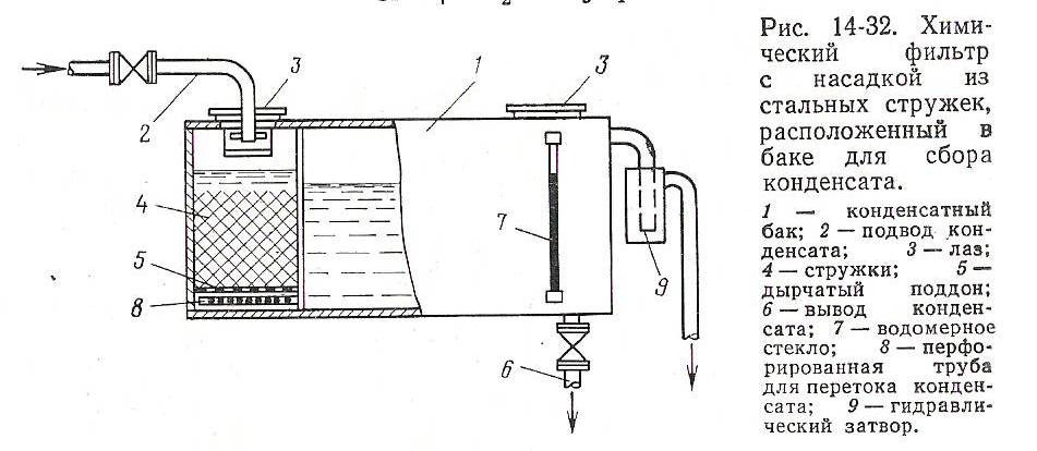 От механических примесей конденсат очищают посредством дренажа конденсатных баков, а также в грязевиках по пути его транспортировки. От газов, главным образом от кислорода, конденсат очищают в деаэраторах (тепловая или термическая деаэрация) и в сталестружечных фильтрах (химическая деаэрция). Один из фильтров с насадкой из стальных стружек, расположенный в конденсатном баке, показан на рис. 14-32.