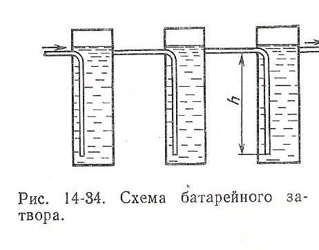 Недостатками гидравлических затворов являются пропуск несконденсировавшегося пара, выброс конденсата при повышенном давлении пара в теплообменном аппарате и большая высота (на каждую атмосферу давления его высота должна быть не менее 10 м). Для устранения этого недостатка применяют батарею затворов, соединенных друг с другом последовательно (рис. 14-34).