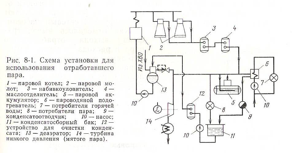 Отработавший в паровых молотах пар содержит хлопья сальниковой набивки и капли масла, поэтому при дальнейшем использовании его подвергают очистке в набивко- и маслоуловителях. В паровых системах теплоснабжения пар подается непосредственно к потребителям. Однако в крупных и протяженных системах теплоснабжения транспортировка пара связана с большими затратами на сооружение коммуникаций. В этом случае, как правило, экономически целесообразнее применять водяную систему теплоснабжения. Теплоподготовительную установку размещают в непосредственной близости от места выхода отработавшего пара, а потребители получают теплоту с горячей водой, транспортируемой сетевым насосом. Как правило, графики выхода отработавшего пара и расходы теплоты не совпадают и для выравнивания графика поступления пара к потребителям (теплоприемники, турбины низкого давления) и устранения перебоев в их снабжении в схеме целесообразно устанавливать паровые аккумуляторы переменного давления.