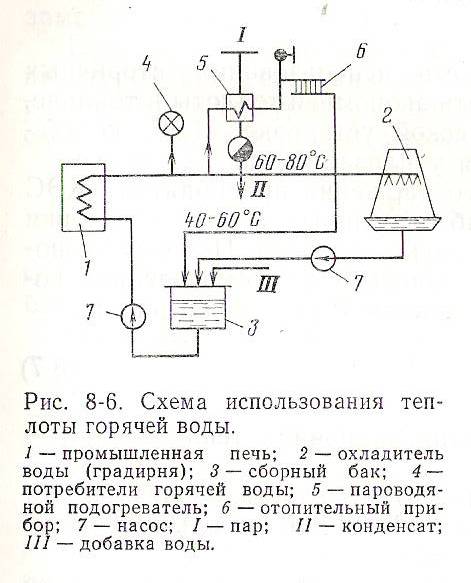 Использование теплоты нагретой воды охлаждающих устройств. Некоторые производственные агрегаты во время работы выделяют большое количество теплоты, которая должна быть отведена для поддержания нормального технологического процесса обычно в качестве охлаждающего агента применяют воду. Охлаждающая вода требуется для работы промышленных печей, различных конденсаторов поверхностного и смешивающего типа, многоступенчатых компрессоров, двигателей внутреннего сгорания и т. п. Наибольшего количества охлаждающей воды требуют промышленные печи.