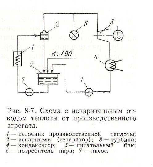 В заключение остановимся на весьма прогрессивном методе использования теплоты охлаждающей воды путем перевода производственных агрегатов на охлаждение кипящей водой (рис. 8-7). Поступающая в производственный агрегат (печь и т. п. ) охлаждающая вода частично испаряется. Полученный пар может быть направлен к тепловому потребителю или в турбину низкого давления для выработки электроэнергии.