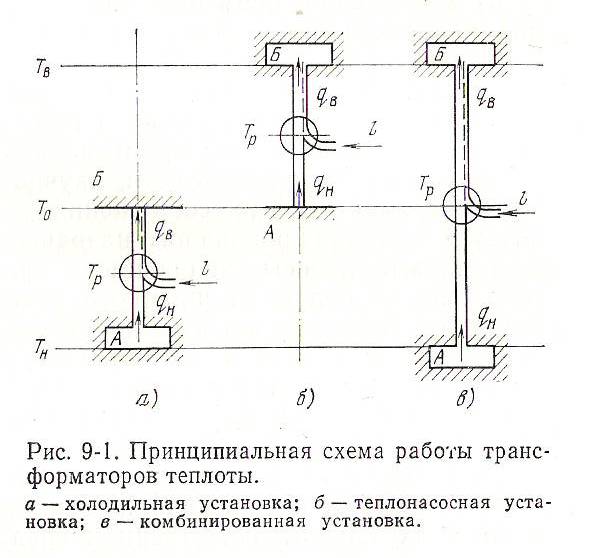 Трансформатор теплоты может работать одновременно как холодильная и теплонасосная установка; при этом Тн< То и Тв > То. Такой процесс называют комбинированным. На рис. 9-1 приведены принципиальные схемы работы трансформаторов теплоты.