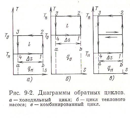 На рис. 9-2 изображены обратные циклы Карно для трансформаторов теплоты, осуществляющих холодильный, теплонасосный и комбинированный процессы.
