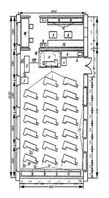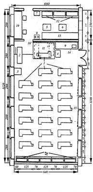 Размещать мебель в классных комнатах, которые имеют прямоугольную конфигурацию, необходимо таким образом, чтобы расстояние между внешней стеной и первым рядом парт составляло 0,6-0,7 м (в зданиях из кирпича допускается 0,5 м), между рядами двуместных парт (столов) - не менее 0,6 м, между третьим рядом парт (столов) и внутренней стеной или шкафами, которые расположены у стены, - не менее 0,7 м, между передней партой (столом) и демонстрационным столом - не менее 0,8 м. Расстояние от передней стены с классной доской к передним столам должно составлять не менее 2,4-2,6 м, от задних столов к задней стене - не меньше 0,65 м (в том случае, если задняя стена внешняя - не менее 1,0 м), от задних столов к шкафам, которые стоят вдоль заднего края стены - не менее 0,8 м, от демонстрационного стола к классной доске - не менее 1,0 м, между столом преподавателя и передним столом учеников - не менее 0,5 м. Наибольшее расстояние от последнего места до классной доски должно составлять 9 м, высота нижнего края доски над полом для учеников 1 класса должна составлять 0,7-0,8 м, для учеников 2-4 классов - 0,75-0,8 м, для учеников 5-12 классов - 0,8-0,9 м.