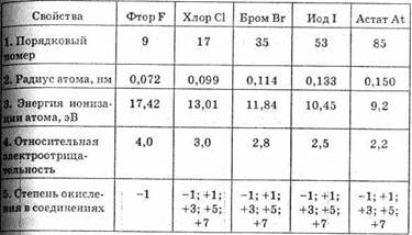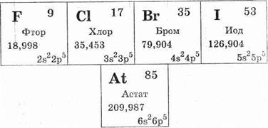 В подгруппу галогенов входят фтор, хлор, бром, иод и астат. Первые четыре элемента встречаются в природе в виде различных соединений. Астат получен только искусственным путем, радиоактивен. Это р-элементы VII группы периодической системы Д . И. Менделеева. На внешнем энергетическом уровне их атомы имеют по 7 электронов ns2np5 (см. табл. 14).