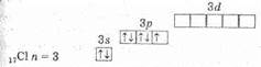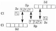 В возбужденном состоянии атома электроны хлора переходят с3p- и3s-подуровней на 3d-подуровень (на схеме показано стрелками). Разъединение (распаривание) электронов, находящихся на одной орбитали, увеличивает валентность на две единицы. Очевидно, что хлор и его аналоги (кроме фтора) могут проявлять лишь нечетную переменную валентность 1,3,5,7 и соответствующие положительные степени окисления. У фтора нет свободных