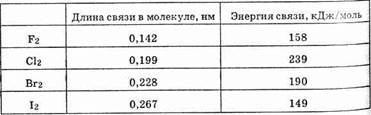 Связь Гал-Гал в молекулах простых веществ ковалентная неполярная. Длина связи в молекуле от F2 к I2 закономерно увеличивается. Энергия же связи изменяется следующим образом.