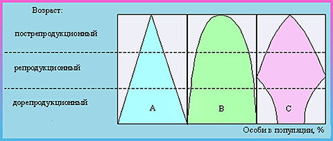 А - массовое размножение, В - стабильная популяция, С - сокращающаяся популяция