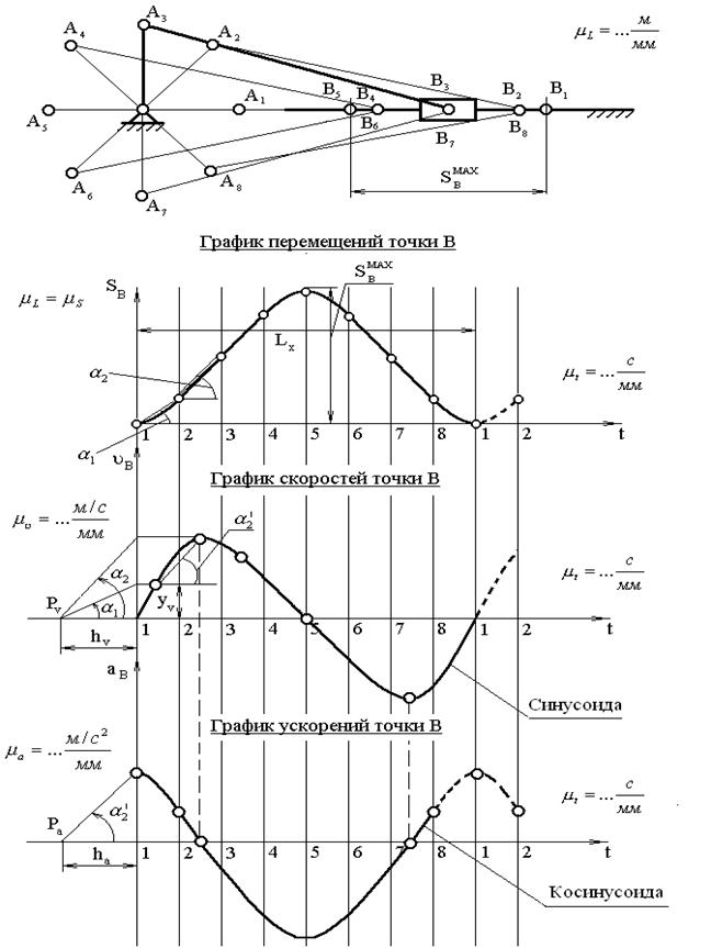 Для определения величины скорости или ускорения в каком-либо положении точки В необходимо длину ординаты соответствующего графика умножить на масштаб mu или ma соответственно.