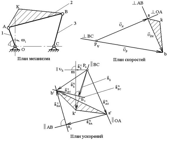 Задачи о скоростях и ускорениях решаются построением планов скоростей и ускорений звеньев механизма при определённых (заданных) положениях ведущего звена на основе заранее составленных векторных уравнений скоростей и ускорений звеньев механизма.