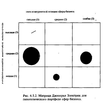 На рис. 6.5.2 приведен пример матрицы Дженерал Электрик для гипотетического портфеля диверсифицированной компании. Радиусы окружностей коррелируют с долями сфер бизнеса в портфеле, величины сегментов внутри них - с рыночными долями сфер бизнеса.