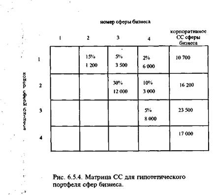 Для окончательной разработки корпоративной стратегии, в частности, для концернов.и с целью повышения эффективности их функционирования необходимо проводить оценки соответствия сфер бизнеса корпоративной стратегии посредством расчета стратегических соответствий между ними. Для этой цели можно применять матрицу СС сфер бизнеса (рис. 6.5.4). В ней по осям отложены сферы бизнеса портфеля, в квадратах - оцененные по специальной методике величины СС, выраженные в денежных единицах за год, квартал, в процентах годовой, квартальной экономии или дополнительной прибыли.
