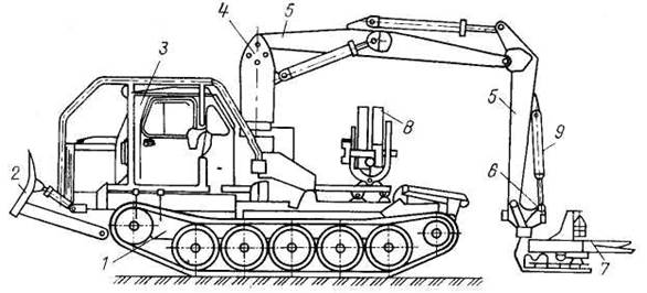 Рис. 1.1. Загальний вигляд звалювально-трелювальної машини ЛП-49: 1 – трактор ТТ-4; 2 – бульдозерний ніж; 3 – кабіна оператора; 4 – поворотна колона з механізмом повороту; 5 – маніпулятор; 6 – підвіска; 7 – захватно-зрізувальний пристрій; 8 –задній візок; 9 – гідроциліндр.