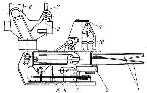 Рис. 1.2. Захватно-зрізувальний пристрій: 1 – поворотні затисні важелі; 2 – привод механізму зрізування; 3 – пиляльна шина; 4 – рама зрізувального механізму; 5 – гідроциліндр затискного важеля; 6 – ручка маніпулятора; 7 – шток гідроцилінра приводу підвіски; 8 – підвіска; 9 – обмежувач; 10 – загородження гідродвигуна.