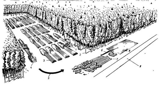 Рис. 1.3. Схема розроблювання лісосіки смугами, перпендикулярно трелювальному вусу звалювально-трелювальною машиною ЛП-49: 1 - звалювально-трелювальна машина; 2 - деревостан; 3 - пачки дерев; 4 - трелювальний трактор; 5 - поворот трелювального трактора; 6 - гілкорізна машина; 7 - штабель дерев; 8 - штабель хлистів; лісовозний вус.
