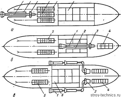 а — в кормовой прорези; б — в миделевой прорези; в — бортам судна; 1 — грунтозабор-ное устройство; 2 — вырез корпуса; 3 — грунтовой насос; 4 — приводной двигатель; 5 — двигатели хода; 6 — грунтовой трюм.