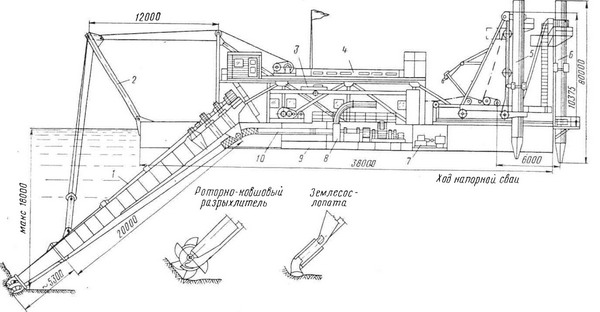 1 — грунтозаборное устройство; 2 — стрела; 3 — надстройка; 4 — суперструктура; 5 — аппарат напорного свайного хода; 6 — прикольная свая; 7 — насосы технического водоснабжения; 8 — главный агрегат; 9 — корпус; 10 — всасывающий трубопровод.