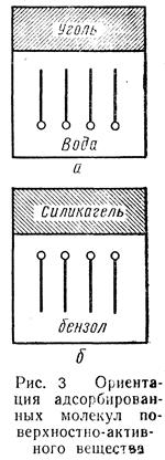 | На основании правила уравнения полярностей П.А. Ребиндера можно сделать вывод о том, что чем больше разность полярностей между растворимым веществом и раствором, т. е. чем меньше растворимость растворенного вещества, тем лучше оно будет адсорбироваться. Правило распределения полярностей разъясняет порядок ориентации молекул поверхностно-активных веществ на границе раздела твердое тело — жидкость. При этом полярная часть молекулы поверхностно-активных веществ будет обращена к полярной фазе, а неполярная часть — к неполярной. Так, при адсорбции из растворов поверхностно-активных веществ углем или силикагелем имеет место различная ориентация молекул адсорбтива. При адсорбции углем к гидрофобной его поверхности обращена неполярная гидрофобная цепь углеродных атомов, а гидрофильная часть молекулы погружена в воду (рис. 3а). При адсорбции поверхностно-активных веществ из неполярных растворителей, силикагелем адсорбируемые молекулы своей гидрофильной частью ориентированы к поверхности адсорбента, а своей гидрофобной углеводородной частью направлены внутрь растворителя (рис. 3 б). Таким образом, все гидрофильные вещества (силикагель, глины) хорошо адсорбируют поверхностно-активные вещества из неполярных или слабо полярных жидкостей. Все неполярные гидрофобные вещества (уголь, графит, тальк, парафин), наоборот, хорошо адсорбируют поверхностно-активные вещества из полярных жидкостей, например, из водных растворов. |