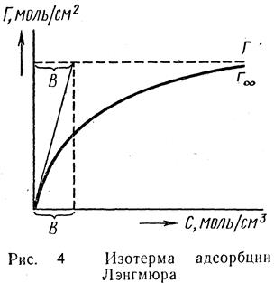 | При постоянной t0 на твердой поверхности адсорбента устанавливается подвижное равновесие, при котором скорость адсорбции Va равна скорости десорбции: Va=KaC(1-x) и V¶ =K¶ X, при равновесии: Va=V¶ или КаС(1-х)=К¶х Þ Х= Þ Х= , отсюда: К¶/Ка обозначим через В, а х заменим на Г/Г¥= Þ Г=F¥ . Последнее уравнение есть изотерма адсорбции Ленгмюра рис. 4. В области малых концентраций когда С®0 (С<<В) можно записать . Следует еще раз отметить, что по теории Ленгмюра адсорбированные молекулы между собой не реагируют.