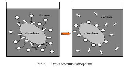 - ионную – когда адсорбент избирательно поглощает из раствора один вид из ионов.