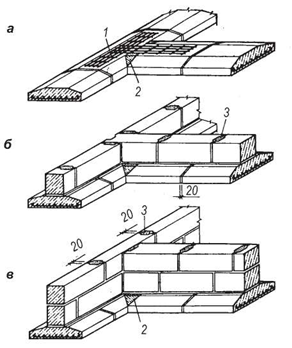 Рис.4. 10 Сполучення фундаментів поздовжніх і поперечних стін: а - сполучення фундаментних плит; б - те саме блоків непарного ряду; в - те саме парного; 1 - сітка з круглої сталі діаметром 6-10 мм; 2 - ділянка, що бетонується на місці; 3 - заповнення шва розчином
