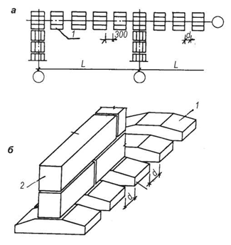 Рис.4. 11 Конструктивне рішення переривчастих збірних стрічкових фундаментів: а-фрагмент схеми розташування фундаментних плит; б-загальний вигляд; 1 - фундаментна плита; 2 - бетонний блок; б - відстань між фундаментними плитами