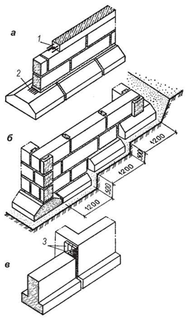 Збірні стрічкові фундаменти під стіни складаються зі залізобетонних плит трапецієподібного перерізу й прямокутних суцільних бетонних стінових блоків. Торці блоків мають вертикальну борозну для шпонки з розчину (рис. 4.8, а, в).