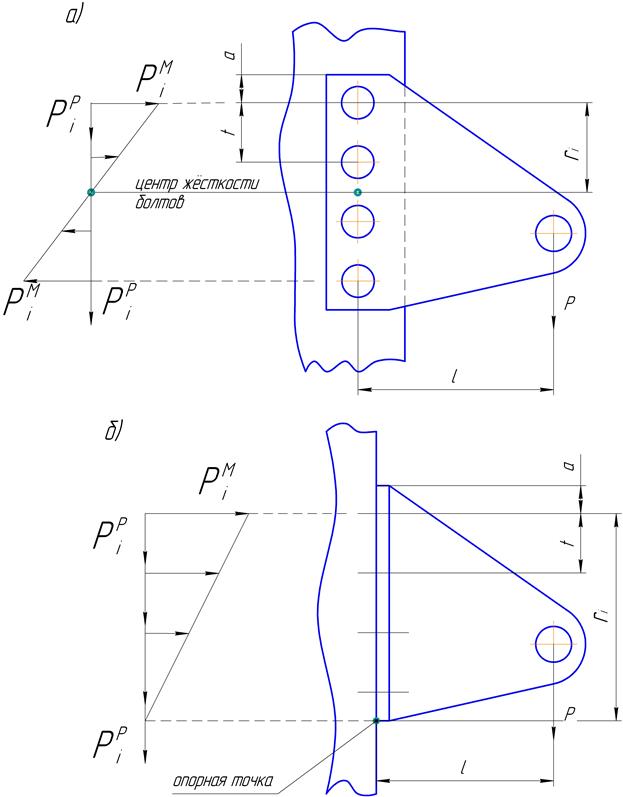 б) диаметры болтов одинаковы и соответствуют усилию в самом нагруженном болте (эффективен в производственном плане).