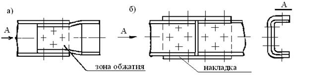 Соединение внахлест проще по конструкции, имеет меньшую массу. Недостаток конструкции – необходимость в большинстве случает подсечки или обжатия (рис. 4.1, а) одного из профилей. Длина нахлеста определяется из условия размещения потребного по условию прочности крепежа.