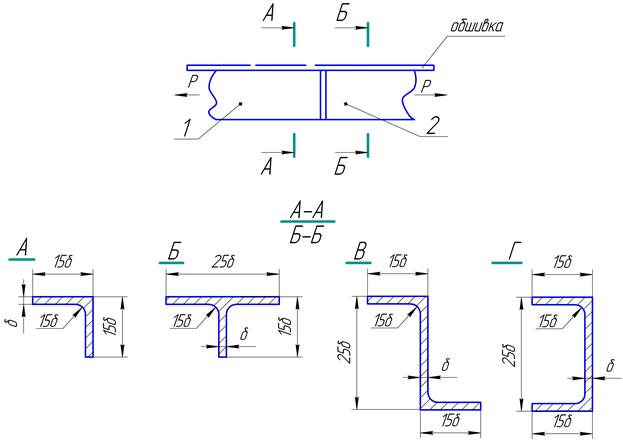 Сконструировать неразъемный стык профилей разных сечений, нагруженных осевой силой (рис. 4.4). Материал профилей – Д16Т. Обеспечить единую поверхность прилегания к обшивке. Стык выполнить в двух вариантах: внахлест и с накладкой.