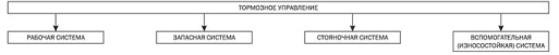 Сукупність всіх гальмівних систем називають системою гальмівного управління. Допускається не обладнувати гальмівним управлінням причепи вагою менше 750 кг. До гальмівного управління пред'являються підвищені вимоги, так як воно є найважливішим засобом забезпечення активної безпеки автомобіля. Вимоги до гальмівних систем автотранспортних засобів встановлені в кількох російських та міжнародних нормативних документах. Більша частина цих документів встановлює вимоги до ефективності гальм нових автомобілів. У технічному плані вимоги до гальмівних систем такі:— забезпечення мінімального гальмівного шляху, встановленого максимального уповільнення або гальмівної сили на колесах;— утримання транспортного засобу на ухилі певної величини на стоянці;— збереження стійкості при гальмуванні (критеріями стійкості служать лінійне відхилення, кутове відхилення, кут складання автопоїзда);— стабільність гальмівних властивостей при неодноразових гальмування, при яких відбувається розігрів гальмівних механізмів;— мінімальний час спрацьовування гальмівного приводу;— слідкуючий дію гальмівного привода, тобто пропорційність між зусиллям на педалі (важелі) і гальмівним моментом на колесі;— мала робота керування гальмівними системами (зусилля на гальмовій педалі, в залежності від призначення автотранспортного засобу, повинно бути не більше 500-700 М; хід гальмівної педалі 80-180 мм);— підтримання сталої швидкості під час руху на затяжному спуску (для допоміжної гальмівної системи);— відсутність повного блокування (юза) коліс;— нерівномірність дії гальм лівого і правого коліс однієї осі не повинна перевищувати певної величини;— відсутність подразнюючих органолептичних явищ при гальмуванні (скрип, неприємний запах);— підвищена надійність усіх елементів гальмівних систем, основні елементи яких не повинні виходити з ладу протягом гарантованого ресурсу.Повинна бути передбачена сигналізація, що сповіщає водія про несправності в системі гальмівного управління.Робоча гальмівна система автомобіля зазвичай приводиться в дію ножний гальмівною педаллю. На автомобілях, спеціально призначених для керування водіями-інвалідами без обох ніг, робоча гальмівна система приводиться в дію рукою від спеціального важеля, закріпленого на кермі. На причепах і напівпричепах робоча система приводиться в дію по гідравлічному, пневматичному або електричного сигналу, що надходить від гальмівної системи автомобіля-тягача в момент початку його гальмування. Існують також гальмівні системи причепів, у яких робоча система починає спрацьовувати внаслідок набігання (накатування) причепа на гальмуючий тягач, при якому виникає сила стиснення в зчепленні. Така гальмівна система причепа називається гальмом накату.