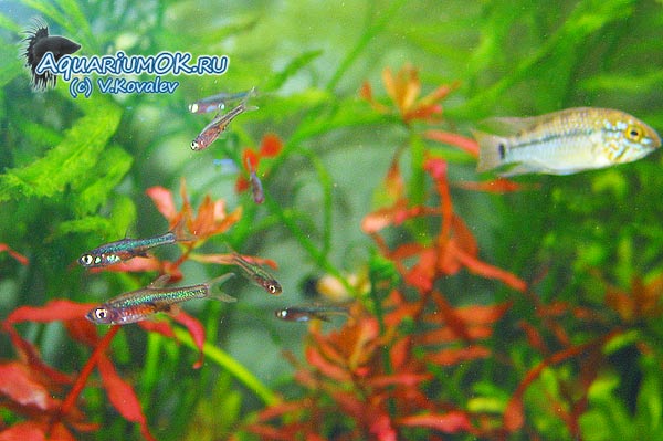 Фото 4.Расборы аксельрода (Sundadanio axelrodi) - мелкие стайные рыбки, в густо засаженном аквариуме-травнике они вполне смогут сосуществовать с мелкими апистограммами (здесь апистограмма Борелла Apistogramma borelli). Даже если цихлидки будут охранять свои нерестовые участки, расборы всегда могут быстро скрыться в зарослях. Таким образом, эти рыбы совместимы, причем совместимость эта "проходит" по всем перечисленным в данной статье факторам.