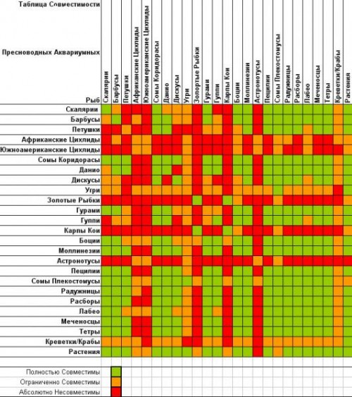 Напоследок приведем таблицу совместимости аквариумных рыбок, которая поможет вам без труда определиться, каким же видам отдать предпочтение в формировании будущего аквариума.