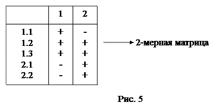 Иерархической структуре рисунка 3 соответствует матричная структура рисунка 5. В этой таблице кроме наличия связей между уровнями иерархии можно указать силу связейлибо словами “сильная”, “слабая”, либо введением в матрицу (таблицу) каких-либо количественных характеристик силы связи.