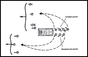 При подходе к минному полю по команде командира взвода или самостоятельно командир отделения подает команду«Маневренная группа, в проход, на рубеж(указывается промежуточный рубеж),бегом -МАРШ»(рис.). Маневренная группа под прикрытием огня огневой группы и БМП (БТР), преодолевает минное поле, занимает указанный рубеж и огнем прикрывает преодоление заграждения огневой группой. БМП (БТР), преодолевает минное поле за мотострелками под их огневым прикрытием.